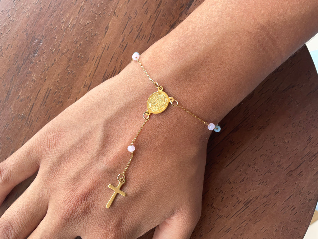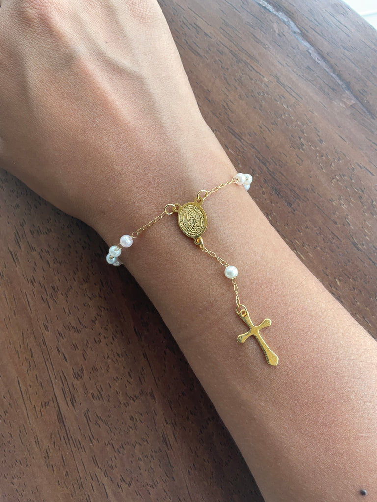 - Hermosa pulsera Denario en material acero inoxidable con baño en oro 24klt con cruz.